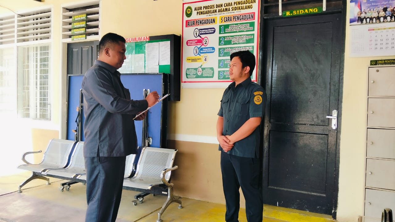 Sidikalang - Selasa, 5 November 2024 Sekretaris Pengadilan Agama Sidikalang Bapak Siswoyo, S.Kom., M.H. melaksanakan Briefieng Morning Satpam, dalam briefing tersebut disampaikan kepada Bapak Ricky Aprianto Simarmata selaku petugas keamanan Pengadilan Agama Sidikalang bahwa untuk selalu menjaga keamanan kantor setiap harinya, selanjutnya Sekretaris Pengadilan Agama Sidikalang menyampaikan untuk tetap menjaga tata tertib tamu Pengadilan Agama Sidikalang sesuai dengan prosedur yang ada seperti memberikan tanda pengena kepada setiap tamu yang datang ke Pengadilan Agama Sidikalang.