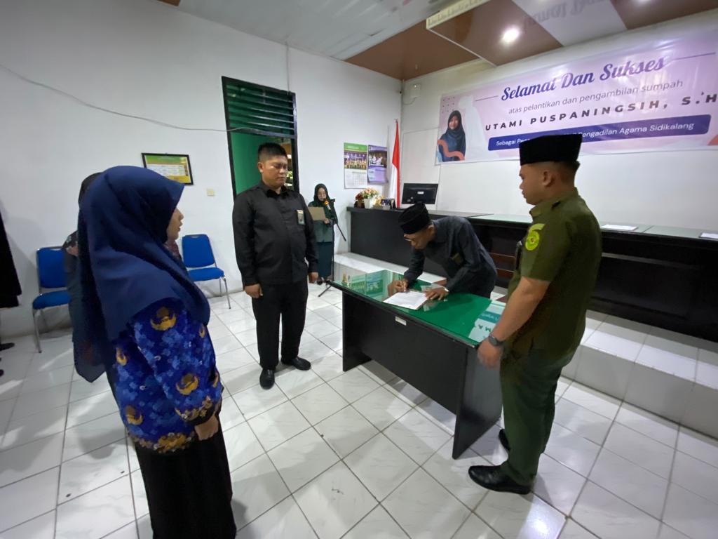 Adapun petugas dalam acara in, protokol, Aprilia Sari Dumenggan Nasution,S.H, Doa, Roihan As'ady Hasibuan, A.Ma, pembaca SK, Tutik Hartatik, A.Md.A.B, Rohaniwan, Isrofi, A.Md serta sebagai ajudan Ketua Pengadilan Agama Sidikalang, Ricky Prianto Simarmata. Dengan saksi-saksi adalah Ramli Affandi Berutu, S.H.I.,M.Ag dan Yusmidawarni Daulay, S.H dan didengarkan oleh seluruh Aparatur Pengadilan Agama Sidikalang dan perwakilan dari ibu-ibu Dharmayukti Karini Cabang Sidikalang, Utami Puspaningsih, S.H mengucapkan sumpah Pegawai Negeri Sipil dengan tegas dan yakin untuk mengemban tugasnya sebagai abdi negara.