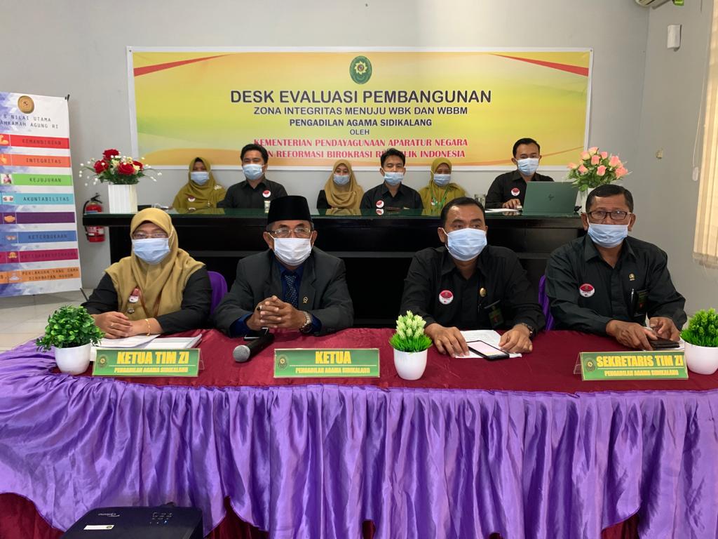 SIDIKALANG | Rabu, 18 November 2020, Pengadilan Agama Sidikalang melaksanakan Desk Evaluasi Pembangunan Zona Integritas secara virtual dengan Tim Penilai Nasional dari Kementrian PAN dan RB. Desk Evaluasi tersebut berlangsung sejak pukul 09.00 WIB hingga pukul 10.00 WIB tepat satu jam pelaksanaan. Ketua Pengadilan Agama Sidikalang, Bapak Rohyan, S.H, dengan didampingi oleh seluruh Pejabat Struktural dan Fungsional selaku koordinator masing-masing area mempresentasikan progrest yang telah dicapai Pengadilan Agama Sidikalang dalam melaksanakan pembangunan Zona Integritas menuju WBK dihadapan Tim evaluator dari Kemenpan RB.